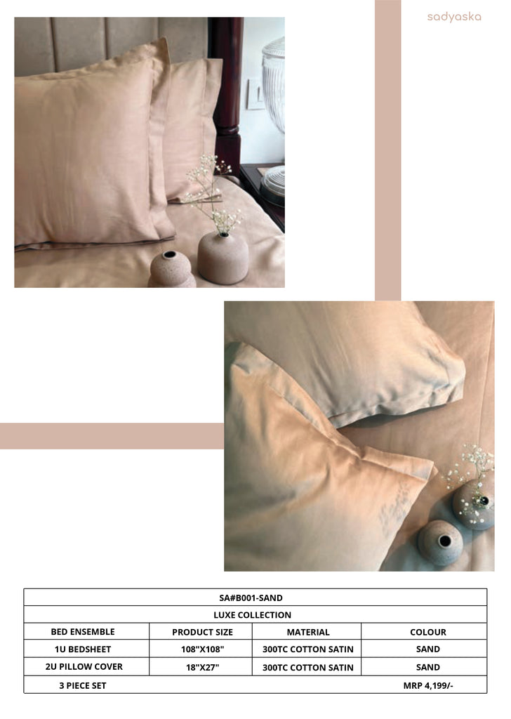 | Premium luxury bedsheet ensemble from Sadyaska. Includes: • 1 Bedsheet (108 x 108 inches) • 2 Pillow Covers (18 x 27 inches) Material: 300TC Cotton Satin Color: Sand Soft, breathable and designed for luxury bedrooms. |