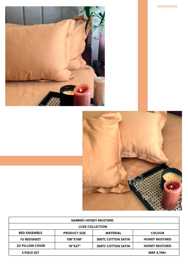| Premium luxury bedsheet ensemble from Sadyaska. Includes: • 1 Bedsheet (108 x 108 inches) • 2 Pillow Covers (18 x 27 inches) Material: 300TC Cotton Satin Color: Honey Mustard Soft, breathable and designed for luxury bedrooms. |