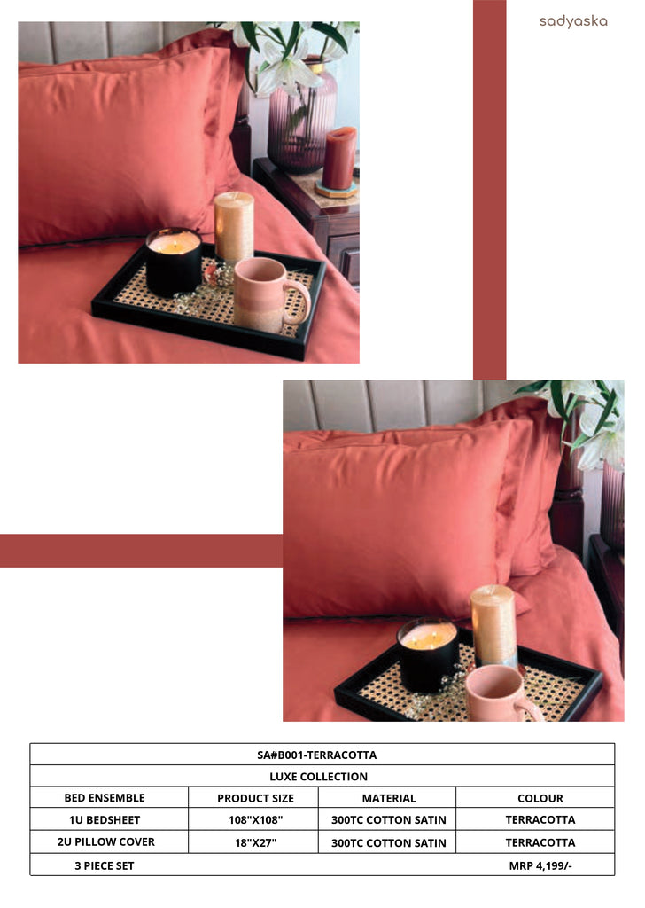 | Premium luxury bedsheet ensemble from Sadyaska. Includes: • 1 Bedsheet (108 x 108 inches) • 2 Pillow Covers (18 x 27 inches) Material: 300TC Cotton Satin Color: Terracotta Soft, breathable and designed for luxury bedrooms. |